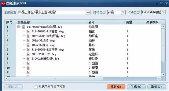 通過與清華天河CAD集成,系統讀取設計圖紙標題欄和明細欄中零部件信息并自動生成產品BOM,在PDM系統中進行產品結構管理,確保設計BOM的完整性、正確性和一致性,為ERP運行提供準確的基礎數據。