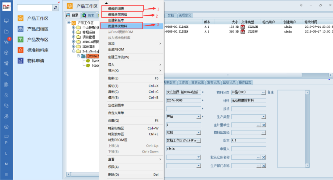 三品PDM系統組織管理企業產品系列,按照產品BOM結構關聯管理產品相關的數據(2D/3D圖紙,生產工藝數據、項目文檔及體系文件),實現產品及技術資料的嚴格受控,建立企業產品庫。(產品BOM數據從建立、歸檔到發布也實現生命周期管理)。