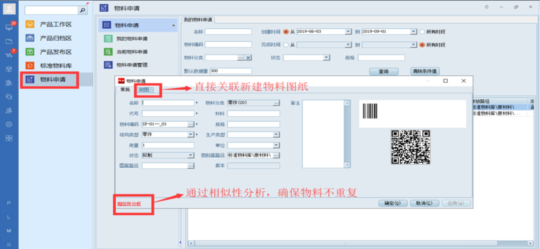 三品PDM系統可以快速新建所需分類的物料,同時可進行物料相似性分析,檢索系統中是否存在相同或相似名稱、規格型號等屬性參數的物料,如果有可直接選用,無需再申請物料,這樣能夠不斷減少新物料數量的增加;如果沒有相似的物料可選用,則可快速提交物料申請流程,經審批確認后物料即可承認并歸檔到標準物料庫關聯的分類目錄下,方便其他用戶查看與選用。