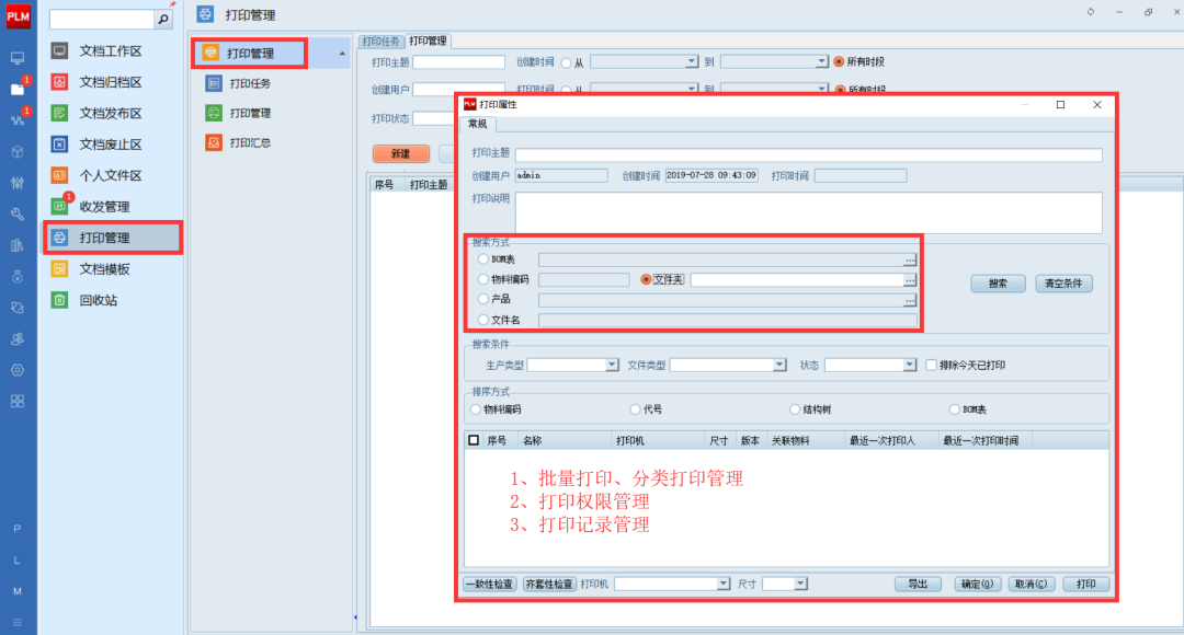 打印管理:支持按文件夾、產品、物料編碼、文件名、文件類型等條件快速批量打印需要下發的圖紙資料,打印任務化、打印記錄集中管理,可快速匯總統計。