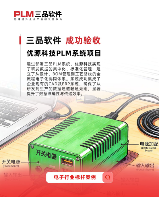 消費電子電源適配器市場變化快,客戶需求多樣,對研發數據和變更過程的效率及準確性要求極高。在此背景下,三品軟件為優源科技構建了高效協同的產品全生命周期管理平臺,重點實現了研發數據的集中化、標準化管理與全流程追溯。