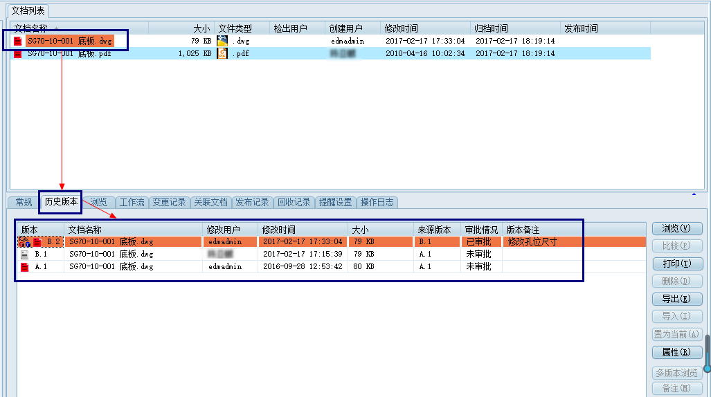 三品EDM系統有效管理所有技術文件、檔案記錄、管理配套文件等電子檔資料,文件在修改及變更后會在系統中產生新的版本/版次,即升版,歷史版本信息見下圖: