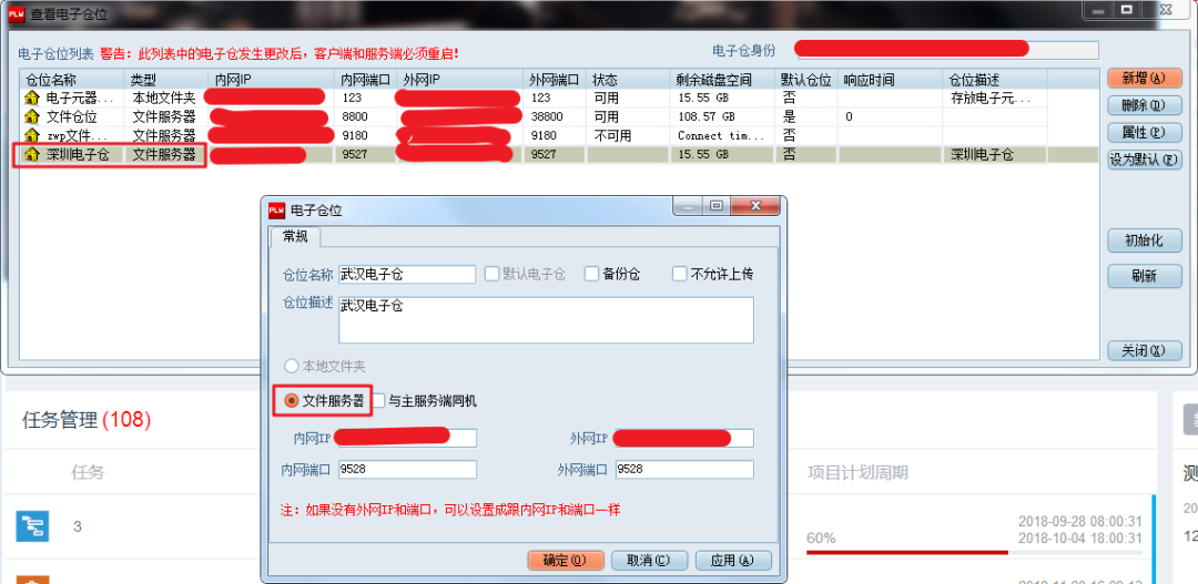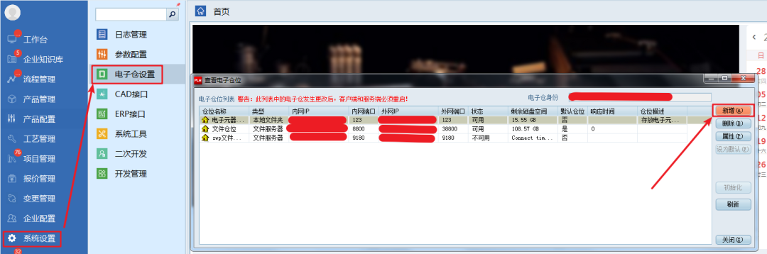 登錄PLM系統,在“系統設置”—“電子倉設置”打開電子倉管理窗口,點擊“新增”,在“電子倉位”窗體中,勾選“文件服務器”,輸入倉位名稱、倉位描述、內外網IP及端口后,點擊“確定”新增電子倉。按照此方法依次新增深圳電子倉和武漢電子倉。