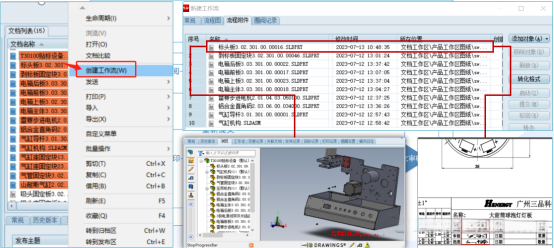 1、設(shè)計人員提交圖紙:設(shè)計人員完成圖紙設(shè)計并自檢后,在三品PLM系統(tǒng)中通過“創(chuàng)建工作流”功能將圖紙?zhí)峤唤o相關(guān)部門或負(fù)責(zé)人啟動審核流程。