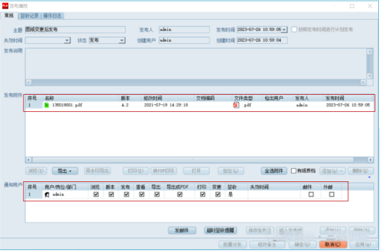 4、發(fā)布與外發(fā)執(zhí)行:審批通過后,在系統(tǒng)中對外發(fā)圖紙執(zhí)行【發(fā)布】操作。“發(fā)布”操作會確定最終外發(fā)版本(文檔狀態(tài)變?yōu)殒i定狀態(tài),圖標(biāo)呈現(xiàn)綠色,不可再編輯修改),并可填寫發(fā)布。系統(tǒng)管理員或授權(quán)人員根據(jù)審批結(jié)果和發(fā)布記錄,通過安全可靠的渠道將圖紙外發(fā)給指定接收方,并詳細(xì)記錄外發(fā)時間、接收方確認(rèn)回執(zhí)等關(guān)鍵信息,確保全過程可追溯。