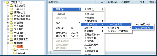 PLM系統(tǒng)操作指引:在三品PLM系統(tǒng)中,可便捷地基于模板創(chuàng)建新文檔。進(jìn)入【文檔管理】的“工作區(qū)”,在目標(biāo)位置右鍵選擇【新建】。根據(jù)需求選擇文檔類型,例如依次選擇【新建】→【三維CAD文檔】→【Pro/E三維文檔】→【Pro/E零件文檔】。