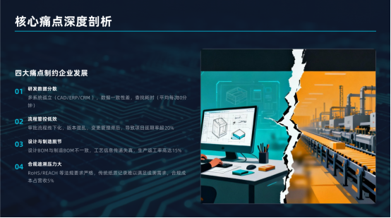 核心要點:電子制造業(yè)普遍面臨研發(fā)管理粗放、數(shù)據(jù)孤島、變更頻繁、合規(guī)嚴苛等挑戰(zhàn),在深圳快節(jié)奏、高競爭環(huán)境下,這些痛點直接轉(zhuǎn)化為訂單交付延遲與成本失控。